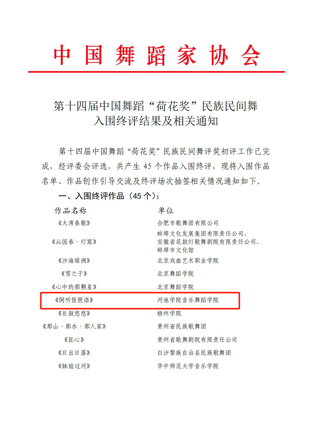 近日,第十四届中国舞蹈“荷花奖”民族民间舞评奖公布了45个入围终评作品名单,金沙官网音乐舞蹈学院原创舞蹈作品《侗听琵琶语》成功入选终评作品名单中。这是金沙官网舞蹈学专业建设的一个重大突破,具有非凡的里程碑意义。